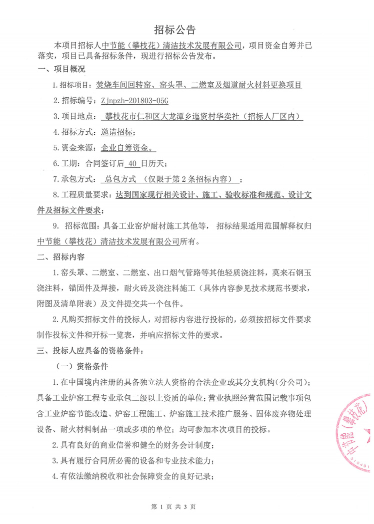 焚燒車間回轉(zhuǎn)窯、窯頭罩、二燃室及煙道耐火材料更換項目招標(biāo)公示